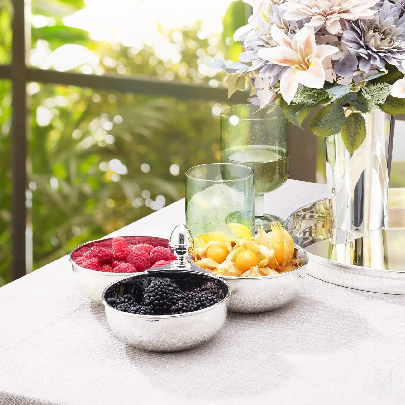 Setul de trei boluri model Vasellame este o piesă realizată din trei boluri circulare mai mici, unite împreună într-o formă unică, ideală pentru ocazii speciale. Realizată manual în Italia din argint masiv 925 cu un finisaj lucios (polished), această piesă de 510 grame este concepută pentru a găzdui mandarine, petale de flori sau praline fine, ocupând cu siguranță o poziție proeminentă în decorul dumneavoastră. Designul distinctiv și calitatea metalului nobil fac din acest set un accesoriu deosebit, ce îmbină măiestria artizanală cu o formă estetică ce va atrage toate privirile pe masa de protocol.